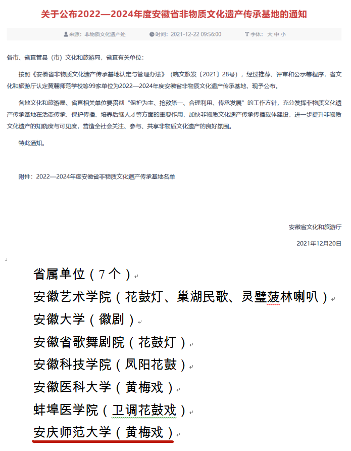 近日,安徽省文化和旅游厅公布2022—2024年度安徽省非物质文化遗产传承基地名单,77779193永利(黄梅戏) 成功入选。1月12日,受安徽省文化和旅游厅委托,安庆市文化和旅游局党委委员、总工程师王勇一行专程来校为黄梅戏传承基地授牌。
