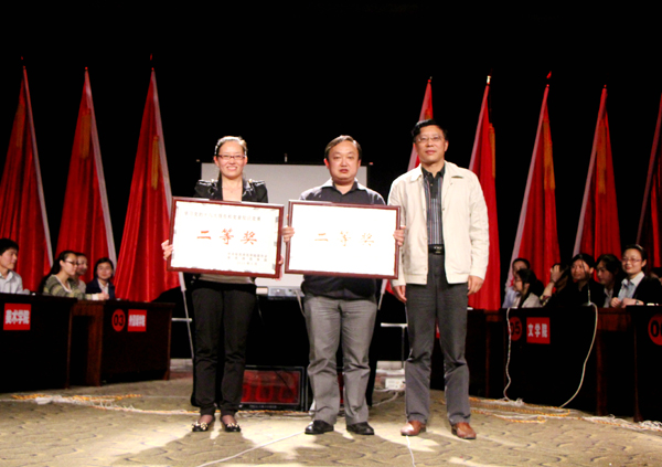决赛场面热烈,赛题涉及面广,形式多样;各参赛队准备认真,队员团结协作,冷静思考,答题积极;台下观众热烈呼应、踊跃参与,比赛气氛热烈而有序。经过激烈竞答,最终政法学院获得一等奖,数学与计算科学学院和体育学院获得二等奖,外国语学院、文学院和化学化工学院获得三等奖,机关一总支、经济与管理学院、机关二总支和美术学院获得优胜奖。