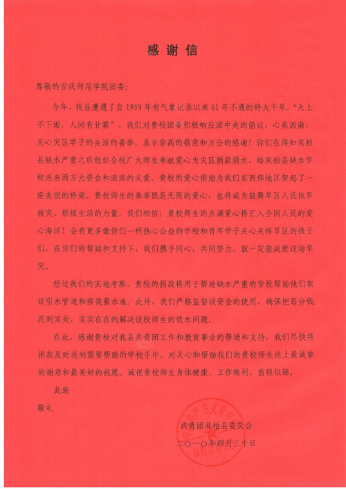 日前,云南省楚雄州双柏县团委给永利官网团委发来感谢信,对永利官网全体团员青年积极响应团中央的号召,心系西南灾区,关心灾区学子生活的善举,表示了崇高的敬意和万分的感谢。