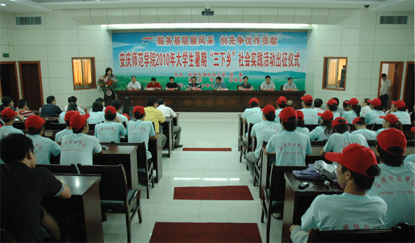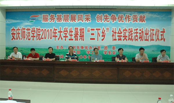 7月12日下午,永利官网在行政楼一楼会议室隆重举行了2010年暑期“三下乡”社会实践活动出征仪式。校党委书记何小祥,党委委员、副院长时新中、王海燕,党委副书记、纪委书记殷红,党委委员、副院长闵永新,副院长张群,党委委员、党办、院办、外事办主任、生命科学学院党总支书记刘友忠,安庆团市委副书记曹立奇出席了仪式,“三下乡”实践活动的指导老师和全体学生近两百人参加了仪式。仪式由校团委副书记刘燕主持。