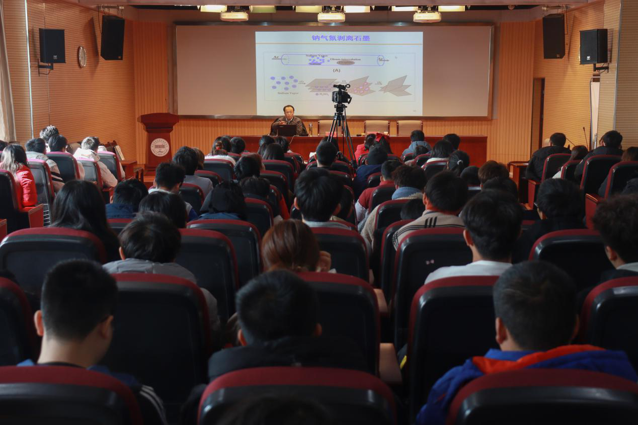 李景虹结合自己的科研经历,以富勒烯、碳纳米管和石墨烯等重要科学成果的发现过程与师生们进行交流,并介绍了自己在石墨烯领域的研究成果。李景虹首先对石墨烯这一材料做了基本介绍,并阐述了石墨烯材料的化学属性在科学研究方面的应用以及生物传感在现实中的应用。他还介绍了钠气氛剥离石墨、高质量石墨烯及其薄膜的化学制备等内容,以“兴趣爱好”“万小时定律”等勉励师生们在科研探索中要保持兴趣、勤奋和坚持,着重启发师生们如何开展科学研究、培养科学思维。