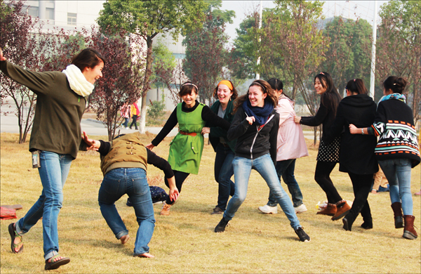为了配合美国交流生完成他们的旅行学习,11月11日文学院选派了15名对外汉语专业的学生,对交流生们每天进行两个小时的 “一对一”辅导。教学的内容和方式,均由外汉专业的学生自己设计。“我是采取ppt展示的方式,向他介绍一些关于中国节日和中国传统习俗的小常识,一些生动有趣的图片更能增加他对上课内容的理解。”汉语国际教育专业13(2)班的刘滢说。而来自大三的王新慧则是选择立足于美国交流生的汉语教材,教他们一些打招呼、问路等比较实用的日常交流用语。“一对一”辅导之后,交流生们被分到不同班级,与永利官网学生进行一小时的课堂交流学习。