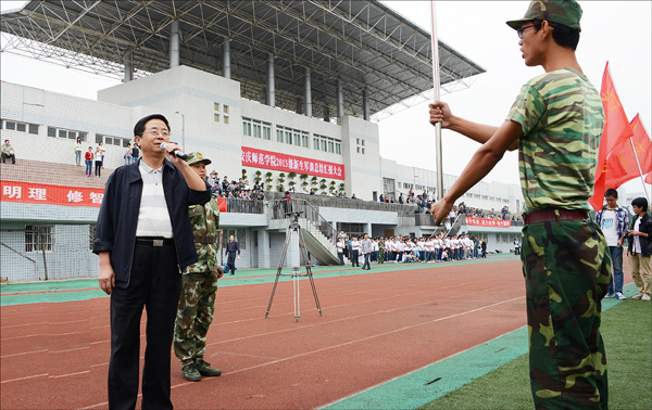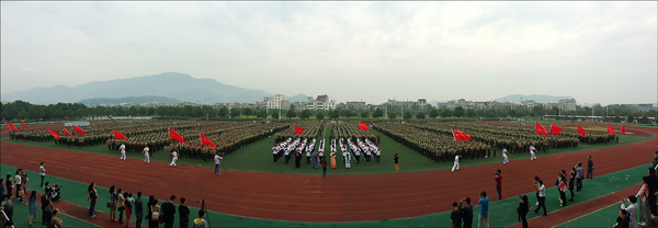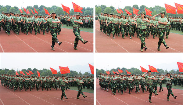 5611名参加军训的新生编制成1个军训旅、3个军训团、11个军训营、100个军训连,在操场上排成10个矩形方阵。面对党委书记何小祥的检阅,同学们齐声回答“首长好”、“为人民服务”。洪亮的声音,在龙山校区上空阵阵回荡。
