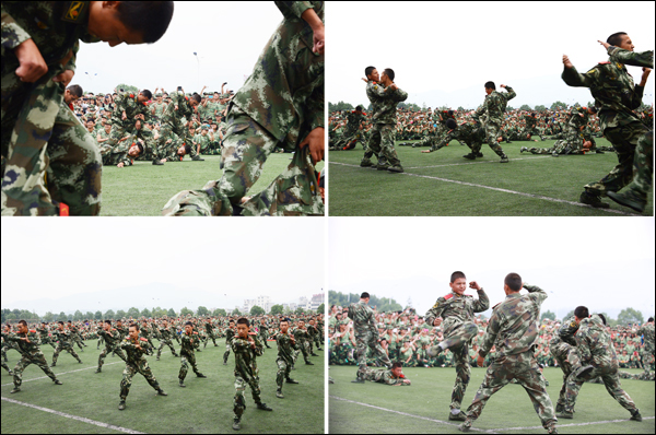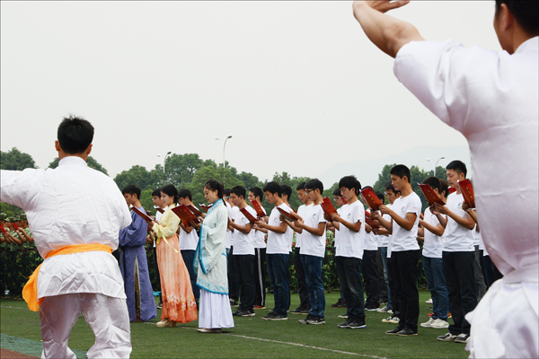 4名学生身着汉服,左右各有3名学生表演太极拳,接着是80名身着白色T恤的学生。他们站在操场中心,诵读《弟子规》。在他们的领读下,周围近6000名新生齐声诵读,语调铿锵有力。