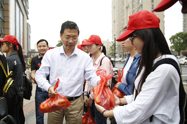 汪时珍亲切询问了志愿者们在志愿服务期间的饮食、交通等细节,并亲手将慰问品送到了同学们手中。他高度赞扬了同学们一丝不苟的工作态度和饱满的工作热情,“安庆师大植根于安庆市,我们每一个安庆师大人都是安庆市市民,都有责任和义务积极参与全国文明城市创建,感谢各位同学为文明创建尽心尽力,大家所做的贡献是值得一生骄傲和自豪的。”他勉励同学们,“志愿服务工作虽然很辛苦,但同学们要铭记‘敬敷世范,勤学笃行’的校训精神,发扬攻坚克难的实干精神,坚守岗位,热情服务,在实践中感知、领悟并践行社会主义核心价值观,以昂扬向上、积极饱满的精神状态投身到创建工作中,充分展现安庆师大学子的风采。”最后,汪时珍还提醒大家在志愿服务期间要时刻关注天气变化,保障自身安全。