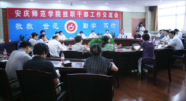 6月18日上午,永利官网在龙山校区行政楼圆桌会议室举行挂职干部交流会。中共安庆市委常委、安庆市人民政府常务副市长汪莹纯,副市长黄杰同志出席会议。中共安庆市委组织部常务副部长桂青,安庆市发改委副主任徐中全、安庆市环保局局长殷宝龙、安庆市经信委主任方一清、安庆市教育工委副书记张泽水、安庆市科技局局长方争鸣、安庆市园林管理局局长章和平、安庆市商务局纪检组长汪诗虹、安庆市旅游局局长刘宗瀚、安庆市林业局副局长郑久余、安庆市渔业局副局长王红松同志参加了会议。