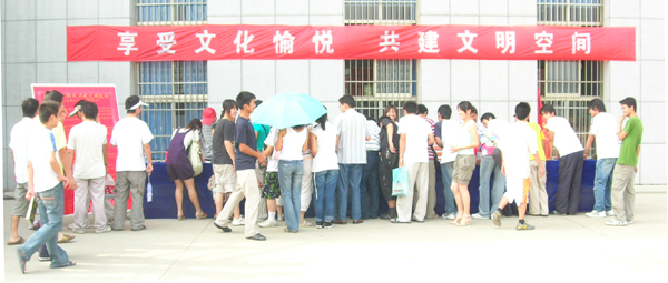 为了使广大学生能充分有效地利用公共自习室,共建安静、文明、整洁、和谐的学习环境,6月6日下午,校学生处联合校团委、图书馆在学校图书馆逸夫楼门前隆重举行了“享受文化愉悦,共建文明空间”大型倡议签名活动。