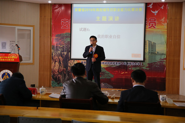 2016年安徽省高校辅导员职业能力大赛分为初赛、复和决赛三个部分,初赛由各个学校自行举办;复赛全省分皖南、合肥、皖北三个赛区;决赛由中共安徽省委教育工委主办,由安徽省高校思想政治教育研究会辅导员研究分会、教育部高校辅导员培训和研修基地(安徽师范大学)承办。比赛项目共分基础知识测试、网文写作、主题班会、主题演讲、案例分析、谈心谈话情景再现等6项,全面考察辅导员对相关知识的掌握程度以及对实际问题的分析破解能力。