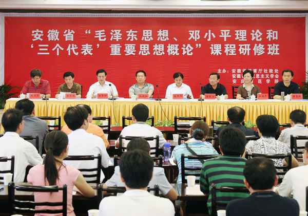 7月23日上午,由安徽省教育厅社政处、安徽省马克思主义学会、安庆师范学院联合主办的安徽省“毛泽东思想、邓小平理论和‘三个代表’重要思想概论”课程研修班在永利官网隆重举行。中共安徽省委教育工委高开华副书记,黄山学院党委书记汪良发,安徽科技学院党委副书记蒋德勤,安徽省委讲师团副团长董玉田,安徽省马克思主义学会常务副会长、秘书长王兆良教授等专家应邀出席大会开幕式。