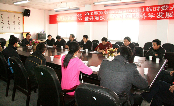 学工部部长、学生处处长戴卫义同志向临时党支部传达学校有关文件精神。他要求临时党支部围绕学校的方案拟定自己的方案,学习实践活动不局限于党员同学,要覆盖到周边的支教同学,起到带动作用;创新方法,创造实践方式,使临时党支部的学习实践活动成为全校的亮点之一。