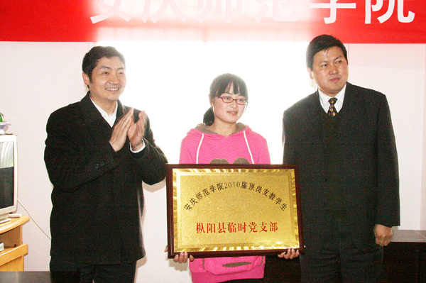 党委组织部部长陈光明同志宣读了《关于成立安庆师范学院2010届顶岗支教学生枞阳县临时党支部的通知》,他希望全体同学珍惜支教机会,努力实现“双赢”,在为社会、为基础教育做贡献的同时,利用这一实践平台了解基础教育现状,进行收集、总结、思考、研讨,努力提高自己,丰富自己,锻炼自己。他强调指出,支教同学分散县内各地,临时党支部要结合实际情况,利用各种形式,抓好学习实践活动,达到效果;临时党支部要争取出一些经验,出一些成果,不辜负校党委对大家的期待。