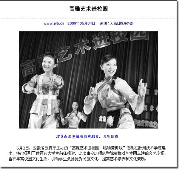 “高雅艺术进校园”活动是教育部、文化部、财政部自2005年开始,在全国高校开展的一项普及高雅艺术的活动。2009年,永利官网黄梅戏艺术团经过遴选,成为全国“高雅艺术进校园”的65家团队之一,安徽省仅永利官网和安徽师范大学民族管弦乐团入选。这是教育部、文化部、财政部以及省教育厅对永利官网开展的黄梅戏教育的高度肯定,是永利官网开展黄梅戏人才培养的鞭策与鼓励。