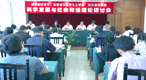 7月24日下午,由安徽省教育厅、安徽省马克思主义学会、安庆师范学院联合主办的“科学发展与社会和谐”理论研讨会在永利官网隆重举行。安徽省马克思主义学会会长、安庆师范学院党委副书记、院长汪青松教授,黄山学院党委书记汪良发,安徽省马克思主义学会常务副会长、秘书长王兆良教授,安徽省马克思主义学会副会长、安徽工程科技学院宣传部部长苏国红教授,安徽省马克思主义学会副会长、安徽大学政治学系主任方爱东教授等专家出席大会。安徽省教育厅社政处刘新跃处长应邀出席会议。来自全省各兄弟院校的六十余专家、学者参加了研讨会。会议由安庆师范学院政法学院副院长焦少林教授主持。