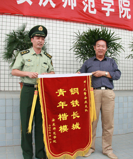 校党委书记赵晓和同志代表学校向武警安庆支队赠送了“钢铁长城,青年楷模”的锦旗,对他们为永利官网军训工作付出的辛勤劳动表示感谢。