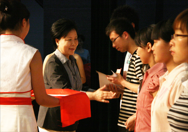 在颁奖典礼上,校党政领导分别为获奖者颁奖。这中间有一个特殊的获奖者,她坐在轮椅上,她就是永利官网外国语学院06级英语6班的刘璟同学。她的坚强让我们感动,她的事迹让我们动容。她脸上洋溢着微笑,她的宁静、快乐与自信,感染着现场的每一个人。2009年她参加全国大学生职业规划大赛,获得大赛唯一的特等奖,她还翻译并出版了长达十万字的《公主传奇》。“尽管我不能像正常人那样驾驭我的身躯,但我可以让思想和灵魂自由飞翔。”刘璟乐观地说道。