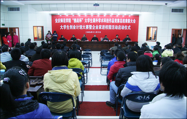 12月10日下午,永利官网“挑战杯”大学生课外学术科技作品竞赛总结表彰大会、大学生创业计划大赛暨企业家进校园活动启动仪式在龙山校区行政楼一楼会议室隆重举行。校党委书记赵晓和,党委副书记、副院长朱士群,党委委员、副院长时新中、王海燕、闵永新,副院长张群,党委委员、党办、院办、外事办主任、生命科学系党总支书记刘友忠出席会议。各院系党政负责同志,教务处、学生处、科技处、学科建设与研究生教育处、团委等部门负责人以及教师学生代表200余人参加了会议。安徽舒信商业管理有限公司、安徽舒怡建设集团副总裁吴为先生一行也应邀参会。仪式由团委副书记刘燕主持。