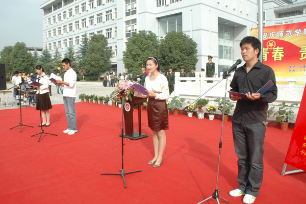 护旗队的队员都是大一新生,他们都是第一次参加这种大型活动。一个月以来,他们每天晚上都来广场上训练走步,一练就是两三个小时,反反复复、来来回回地走上n遍,才练就了今天的姿态。“我是09体育系的,因为身高优势才被选来当护旗手。说不辛苦那是假的,按规定我们都要穿皮鞋练正步,我的脚都磨得起泡了。不过,能参加我们的成人礼,我觉得是很荣幸的。”护旗手曹松笑着对记者说。记者还注意到,他们都统一穿着安庆武警的军装,看起来英姿飒爽。09历史教育专业的莫磊同学说:“平时我们训练还能嘻嘻哈哈的,但一穿上这军装,感觉马上就不一样了,仿佛是穿上了一种荣耀,想不严肃都不行。”