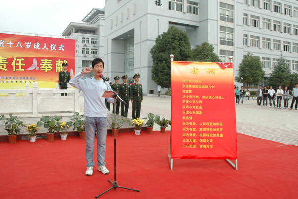 宣誓声在每个学生的心中回荡,十八岁,我已成年;十八岁,花一般的季节;十八岁,让我们放飞自己的青春的梦想,把绯红的心愿写满天空吧,让我们告别昨日,踏上寻梦的征程。