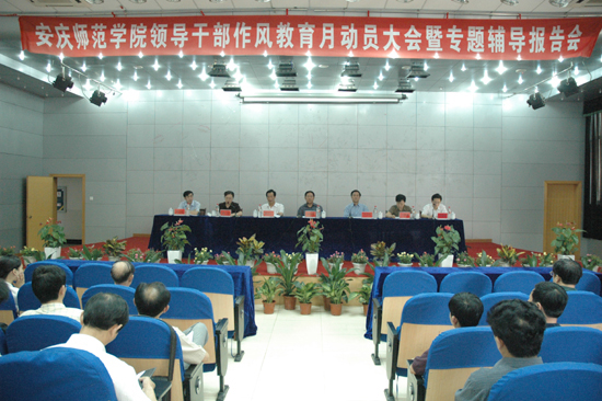党委副书记、院长汪青松主持会议并要求全校教职员工要深入学习胡锦涛总书记在中央纪委第七次全体会议上的重要讲话精神和赵书记的动员报告,认真研究贯彻《安庆师范学院领导干部作风教育月活动方案》,联系本单位实际,抓好落实;要理解作风建设的五个关键点,分别抓好思想、学习作风,工作、领导作风,生活作风等三个方面的作风建设,做到勤政、敬业、求真务实;要将作风教育月活动与本科教学水平评估的整改和教学评估成果的巩固和利用工作结合起来,进一步增强紧迫感、危机感、责任感和使命感。