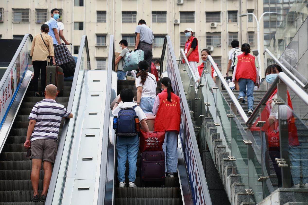 为了让新生一路畅行,学校从出站口的“特别通道”到出站的电梯,再到站前广场和班车都安排了身穿红色马甲的志愿者帮助新生提拿行李和维持秩序。据了解,迎新的三天时间,每天都有近50名志愿者在此服务新生,而学校本次迎新活动共招募了3500余名志愿者,他们活跃在学校和车站的各个角落,服务于新生报道的每一个环节。