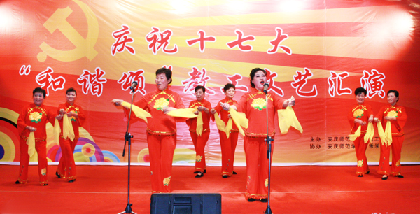 12月28日晚,由校工会主办,音乐学院协办的庆祝十七大《和谐颂》教工文艺晚会在学校菱湖校区学术报告厅举行。学校党政领导赵晓和、汪青松、时新中、殷红、闵永新,省政协常委丁伯华,离退休老领导朱建华、陈自诚、刘和武和各院系、部门主要负责人与300余名教职员工欢聚一堂,一起观看了精彩的演出。