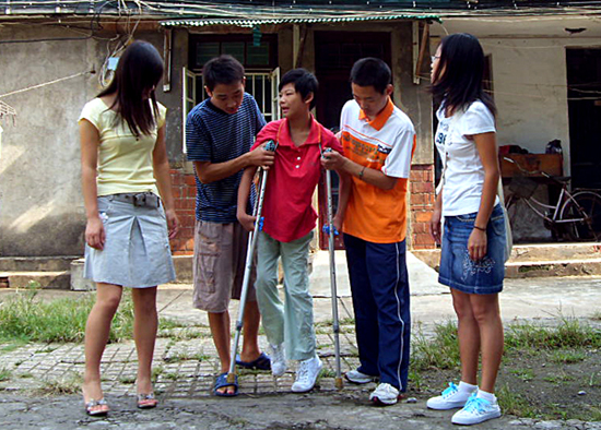 几乎每天,在菱湖校区都能看见这样感人的一幕——几名大学生在帮助一名残疾女孩做恢复训练。他们一边陪她聊天,一边搀扶她练习走路。这一幕也成为菱湖校园里一道绚丽的风景。