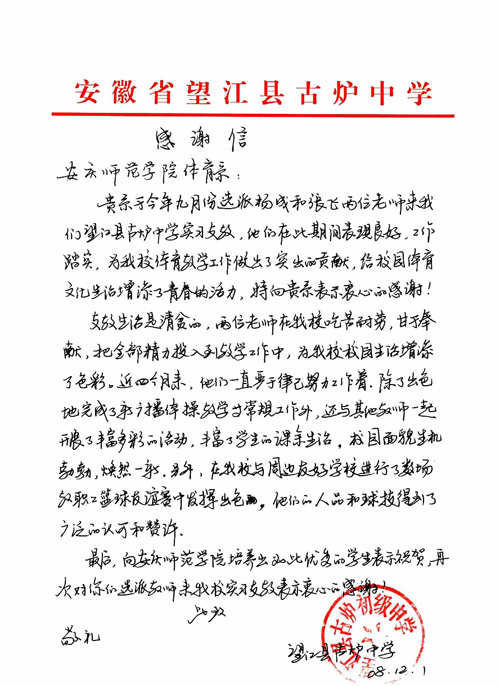 近日,永利官网体育系收到了一封来自望江县古炉中学的感谢信。在信中,古炉中学对永利官网实习支教学生张飞和杨成的实习支教工作给予了高度评价,并感谢永利官网在推进基础教育中做出的贡献,感谢永利官网支教学生在条件艰苦的基础教育第一线以高度的责任感,认真积极地实施体育教学,工作扎扎实实,将自己的所学无私奉献给当地农村教育,让当地学生学到新知识、真本领,为农村校园体育注入了生机与活力。