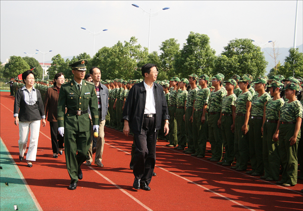 “同学们好,同学们辛苦了!”党委书记何小祥一边检阅军训学员,一边大声喊道。同行检阅的副院长时新中、王海燕,党委副书记、纪委书记殷红,党委委员、办公室主任刘友忠等领导面带微笑。“首长好,为人民服务。”受阅新生们用超高分贝的声浪回答着。