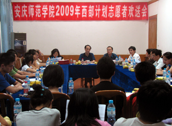 7月24日下午,2009年西部计划志愿者欢送会在菱湖校区红楼大会议室举行。校党委委员、副院长时新中出席了会议,相关部门和院系有关负责同志、辅导员代表及志愿者代表参加欢送会。会议由团委副书记朱新华主持。
