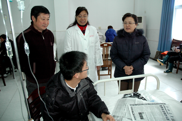 在输液室,殷红同志走到正在输液的计算机与信息学院、人文与社会学院、物理与电气工程学院学生面前,亲切问起他们目前的身体与生活情况,叮嘱他们气温下降的时候要多穿衣服,减少外出次数,积极配合医生治疗,早日康复,以百倍的精神投入到新的学习生活中去。