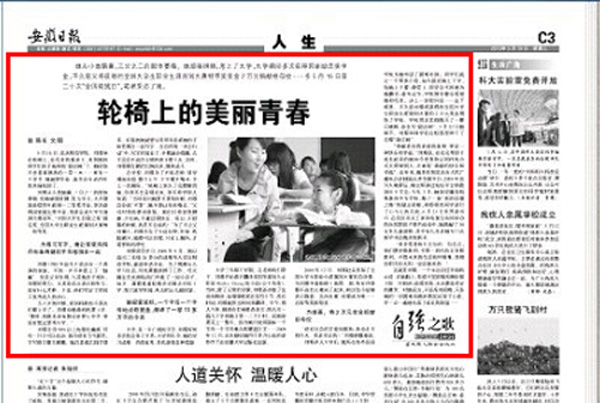 5月19日,《安徽日报》C3人生版头条大篇幅刊登了由党委宣传部陈东同志采写的永利官网学子刘璟事迹——《轮椅上的美丽青春》一文。
