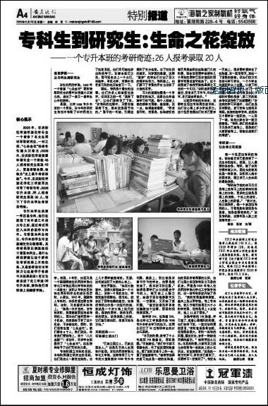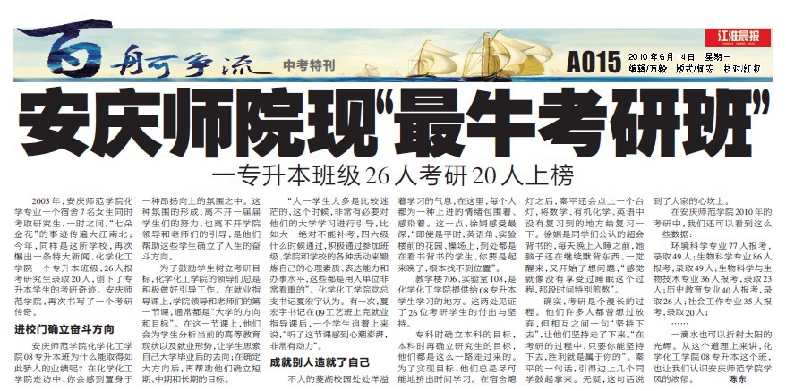 宣传部陈东采写的稿件被新华网、中国网、中国教育网、中国教育在线、中安在线、安徽教育网、江淮晨报等省内外8家重要媒体广为报道。6月28日,《安庆晚报》更是用一个整版对该事件进行了突出报道。这几年,永利官网教学质量和学风建设带动考研率逐年升高已经广为人知,在社会上引起了强烈反响。
