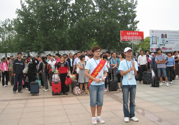 9月9、10号,是永利官网2010级学生入学的日子,6000名新同学和他们的家长们从各生源地向安庆进发,为了做好迎新接站工作,校团委组织了390多人次有学生志愿者投入迎新工作,他们早上5:30就要出发迎接第一趟火车,晚上10:30才能从总接待点下班,中间吃的是冷饭、喝的是凉水,晒黑了、雨淋了,但同学们始终坚持在工作岗位上,把最温暖的笑容、最体贴的照顾带给每一个新同学和他们的家长,让2010级新生一来到安庆就能体会到安庆师范学院的关怀,并把这种互助、共情的志愿精神传递、延续下去。