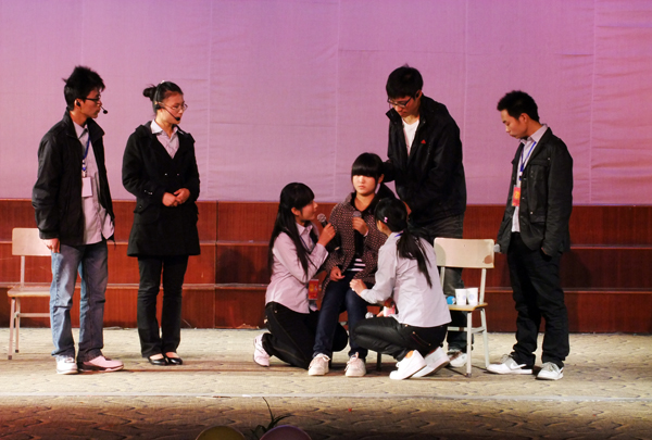 关于这场为安庆市脑瘫患儿们举行晚会的策划,还要追溯到一年前永利官网学生自发成立的一个专门服务脑瘫患儿的汇爱志愿服务队。舞台剧《圆梦》就向我们讲述了这样一个故事。在与安庆市几个脑瘫患儿家庭建立帮扶联系之后,志愿服务队的成员每个周末都会专门前往他们家里,陪孩子看电视、教他们唱歌和写字、帮他们进行发声和肢体的锻炼。志愿者吴冬菊说:“每次陪他们的几个小时都是我们这一周感觉到最充实的时光。有一次,我听见孩子很艰难地说出了‘姐姐好’,我非常感动。”