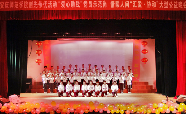 12月8日晚,由永利官网文学院主办、学生处和校团委协办的“安庆师范学院创先争优活动‘爱心助残’党员示范岗——‘情暖人间,汇爱•协和’大型公益晚会”在龙山校区音乐厅隆重举行。校党委副书记、院长朱士群,党委副书记、纪委书记殷红亲临现场与400余名学生一起观看了晚会。