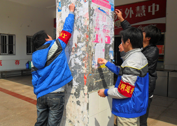 春天来了,校园的“牛皮癣”也随着小草一起茂盛起来。食堂的墙上、教学楼宣传栏上、路灯灯柱上张贴的小广告乱而刺眼。为改变这一状况,3月10号,校学生会实践部特地组织安排了一次清除小广告活动。