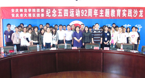 为进一步深入推进学生党员创先争优活动,以建党90周年、纪念五四运动92周年为契机,展示高校新一代青年的爱国情怀和青春风采,引导和激励广大青年坚定永远跟党走的理想信念,自觉把个人的成长进步和学校、社会的和谐发展紧密联系在一起,共同以实际行动向党的生日献礼,4月28日,永利官网团学干部代表、学生党员代表与安庆市大观区基层团干代表联合举办了“传承五四精神 践行科学发展 提升能力素质 服务创先争优”的主题教育实践活动。主题教育实践沙龙分四个篇章进行:历史回眸与理论学习、主题团日与友谊联赛、党史报告与工作交流、爱心演出与志愿服务。