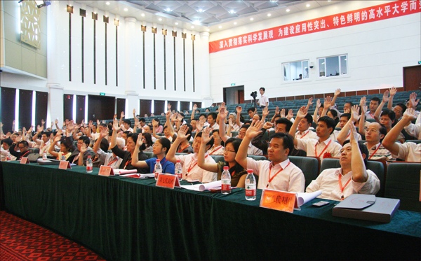 大会指出,未来五年是学校建设和发展的关键时期。必须高举中国特色社会主义伟大旗帜,以党的十七大、十七届三中、四中、五中全会精神为指导,深入贯彻落实科学发展观,加强和改进党的建设,团结带领广大师生员工进一步解放思想,坚持改革创新,紧密围绕“优化结构、强化特色、提升内涵”这条主线,紧抓提高人才培养质量、提高服务经济社会发展的能力和水平“两大战略重点”,深化内涵建设,促进科学发展,全面提高办学水平,与时俱进,奋力崛起,努力实现新的跨越。