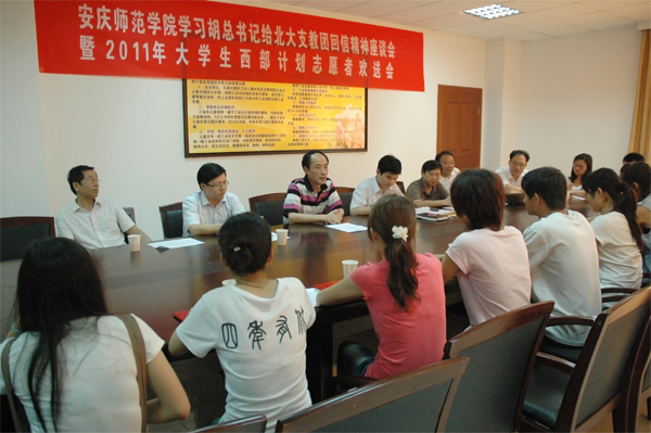 6月22日下午,永利官网学习胡锦涛总书记给北京大学第十二届研究生支教团成员回信精神暨2011年西部计划志愿者欢送座谈会在龙山校区行政楼五楼会议室举行。副院长时新中出席了会议,学生处、招生就业处、团委和院系分管学生工作的副书记、辅导员代表及志愿者代表参加欢送会。会议由校团委副书记朱新华主持。