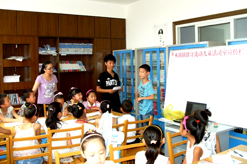 7月9日,“文化宣传服务团”义务支教正式上课的第一天。早上7时,支教老师们来到木镇镇文化活动中心做好准备,等待即将来上课的孩子。8时左右,家长陪伴着孩子们陆续前来报到,并签署《暑期安全承诺协议书》,登记《安庆师范学院2011年暑期“三下乡”社会实践活动义务“文化宣传服务团”支教学生信息表》。半个小时的时间里,服务队招收3—9年级学生共33人。由于学生们的年龄跨度较大,服务团将支教分为第一课堂和第二课堂分别进行教学。这两个课堂分别被安排在文化活动中心的两间会议室里。会议室里备有图书、写字板、益智玩具,还有队员们从宿舍里带来的大落地扇,整体环境较适宜学生们的学习。