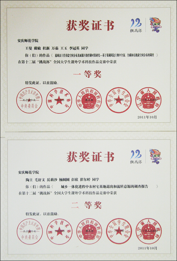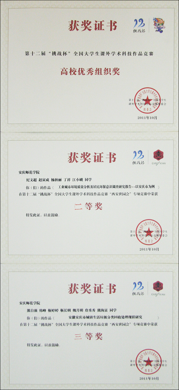 备战“挑战杯”期间,校党政领导的高度重视,各相关部门和学院鼎力支持,指导老师悉心指导,参赛同学认真准备,在今年的校级比赛中,参赛作品数量和质量较之往年都有了较为明显的提升,共有330件参加比赛,直接参与比赛的同学近3000人次。校内比赛结束后,学校选派专业老师加强指导,不断完善作品内容,提高作品的层次。2011年5月,永利官网选定了6件作品参加第四届“挑战杯”安徽省大学生课外学术科技作品竞赛终审决赛,取得了2件一等奖,4件二等奖的好成绩,学校再次捧得“优胜杯”。这次“挑战杯”全国大学生课外学术科技作品竞赛终审决赛中,由资源环境学院的陈书琴、刘俊老师指导,王曼、戴敏、杜新、万茹、王玉、李冠英等同学的作品《流域表土营养盐空间分布及面源污染控制对策研究--基于巢湖周边土壤中全氮、全磷和有机质空间分布的调查》荣获一等奖;由经济管理学院彭长生、黄先军老师指导,陶主、彭欣、杨圆圆、毛舒文、崔尔婷、岳莉沙的作品《城乡一体化进程中农村宅基地退出和流转意愿的调查报告》荣获二等奖;“西安世园会”专项竞赛中,永利官网选送的由资源环境学院徐志兵教授指导,纪文超、赵寅成、江小娥、杨秋丽、丁祥等同学作品《工业城市环境质量分析及居民环保意识调查研究报告--以安庆市为例》获得全国二等奖,钮志远老师、张群教授指导,熊自强,魏月明,詹秀秀,靳长明,靳婷婷,熊海富等同学作品《安徽安庆市城镇生活垃圾分类回收处理现状研究》获得全国三等奖。
