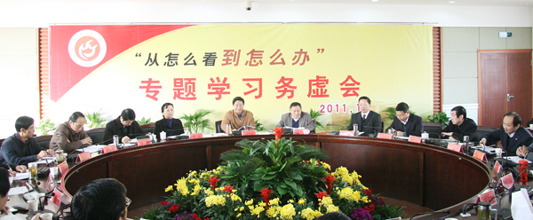 为深入学习宣传和贯彻落实党的十七届六中全会、省第九次党代会和学校第五次党代会精神,全面推进应用性突出、特色鲜明的高水平大学建设步伐,11月25日,校党委在龙山校区召开“从怎么看到怎么办”专题学习务虚会。校领导何小祥、朱士群、殷红、闵永新、张群、汪时珍、时新中和党委委员、刘友忠、陈光明、方锡球等出席会议。全校各院系党政主要负责人,机关各职能部门主要负责同志参加了会议。