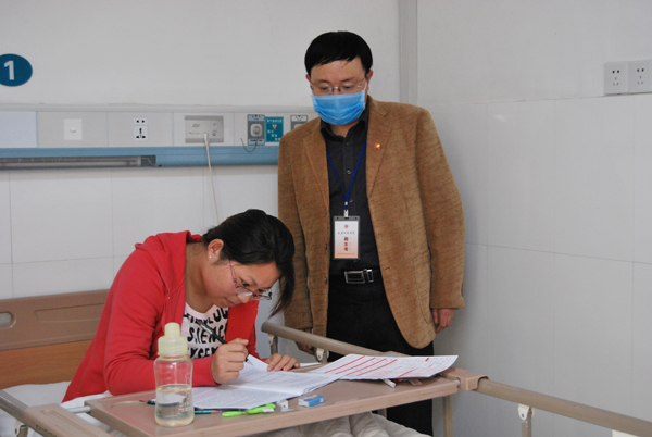 此刻,学校领导、老师也时刻牵挂着她,替她想着这一对她人生来说很重要的一次考试。“设立专门考场,我们绝不能放弃一个学生”,外国语学院院长郝涂根在获悉她的情况后,立即向学校领导和全国高校英语专业四级考试组委会提出了启用备用试卷并在医院设立专门考场的申请。在得到批复后,学院党总支副书记王志红第一时间赶往市立医院协商为詹叶设立特殊考场事宜,院方在得到主治医生病情分析和许可后同意设立专门考场,但要求考务人员进入病房必须佩戴口罩,考试期间要求主治医生陪同,随时应对紧急情况。
