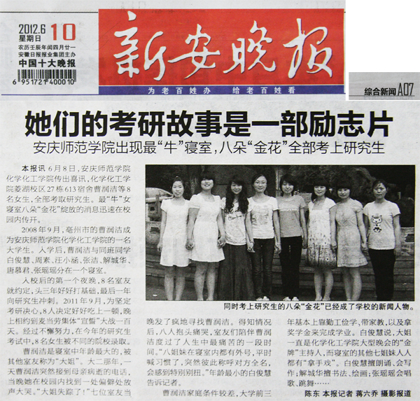 6月10日,《新安晚报》以“她们的故事是一部励志片——安庆师范学院出现最‘牛’寝室,八朵‘金花’全部考上研究生”为题,大篇幅报道了永利官网化学化工学院菱湖校区27栋613宿舍8名女生的考研佳绩。