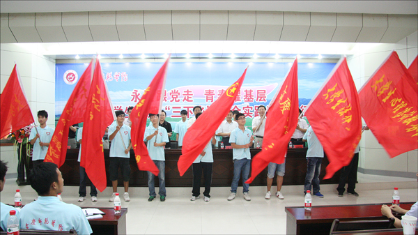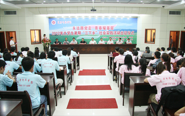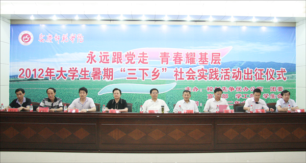 6月29日上午,永利官网2012年大学生暑期“三下乡”社会实践出征仪式在龙山校区行政楼一楼会议室隆重举行。校党委书记何小祥,党委副书记、院长朱士群,党委副书记、纪委书记殷红,党委委员、副院长闵永新、张群、汪时珍,督导员时新中,党委委员、党办、院办、外事办主任刘友忠,党委委员、组织部部长陈光明等校党政领导出席仪式,校创先争优办公室、党委宣传部、学生处、团委负责同志,各学院党总支负责人、团总支负责人、学校“三下乡”重点团队以及青年志愿者代表近200百人参加了本次仪式。仪式由校团委副书记朱新华主持。