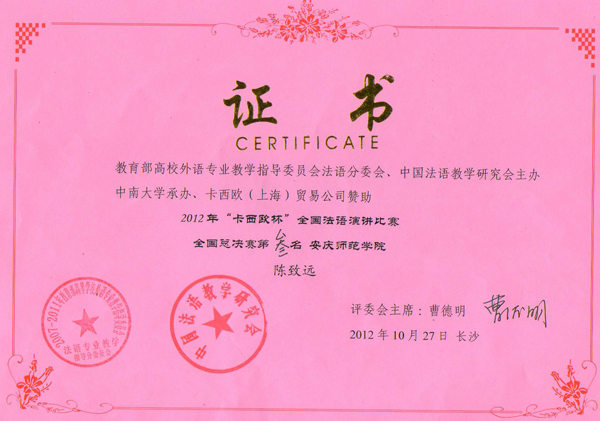 近日,永利官网法语专业学生陈志远在2012年“卡西欧杯”全国法语演讲总决赛中荣获全国第三名的优异成绩。