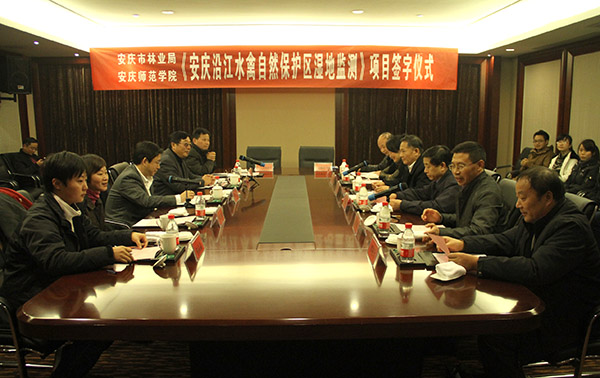 安庆市林业局、安庆沿江水禽自然保护区管理处和永利官网生命科学学院领导分别介绍了沿江湿地及项目实施方案等情况。安庆沿江水禽自然保护区管理处王康明处长与生命科学学院吴甘霖院长分别代表安庆市林业局和安庆师范学院正式签订《自然保护区湿地监测》项目合同书。
