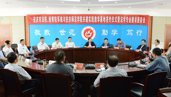 9月26日上午,永利官网与安庆市法院、检察院系统共建法学专业实践教学基地签约仪式暨法学专业建设座谈会隆重举行。校党委书记何小祥、副院长闵永新、副院长张群,安庆市中级人民法院院长张小红、安庆市人民检察院检察长李军出席会议;安庆市中级人民法院副院长汪晓波、徐芳水、纪检组长刘怀,安庆市人民检察院副检察长吴为坤、吴仲伯、政治处主任焦建国、党组成员杜象平,安庆市大观区人民法院院长光彩,宜秀区人民法院院长丁文军和人民检察院检察长孙庆健,怀宁县人民检察院检察长欧阳水根、望江县人民法院院长徐光华和人民检察院检察长胡少斌,永利官网教务处和人事处主要负责同志,政法学院党政领导参加了会议。会议由闵永新副院长主持。