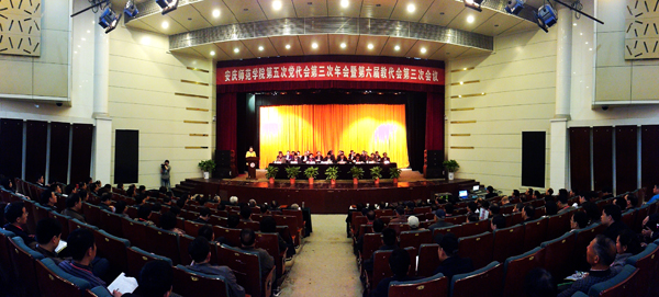 党委书记何小祥代表中共安庆师范学院委员会作工作报告。何小祥对一年来的主要工作进行了回顾。第二次年会以来,校党委紧紧围绕建设应用性突出、特色鲜明的高水平大学的奋斗目标,锐意进取,开拓创新。党委班子充分发挥政治核心作用,在“重教学、强科研、抓人才”上下功夫,深化内涵建设,优化办学结构。学校党员干部作风明显转变,办学治校能力得到提升,基层组织建设成效显著,干部素质队伍不断提高,宣传思政工作扎实有效,党风廉政建设深入开展,统战群团及离退休工作积极有为。全校上下团结和谐,风正劲足,保持着良好的发展态势。一年来,学校顺利完成提升计划和振兴计划的组织申报与执行工作,在国家基金项目、人才队伍建设、学位点建设上取得新突破,在质量工程建设、协同创新工作、对外合作办学与校园基本建设上取得新进展,各项事业取得了长足发展。2014年,学校要坚持以深化改革为动力,以调整结构、促进转型、提高质量、增强活力为主线,加快应用性突出、特色鲜明的高水平大学建设步伐,推动学校各项事业发展再上新台阶。