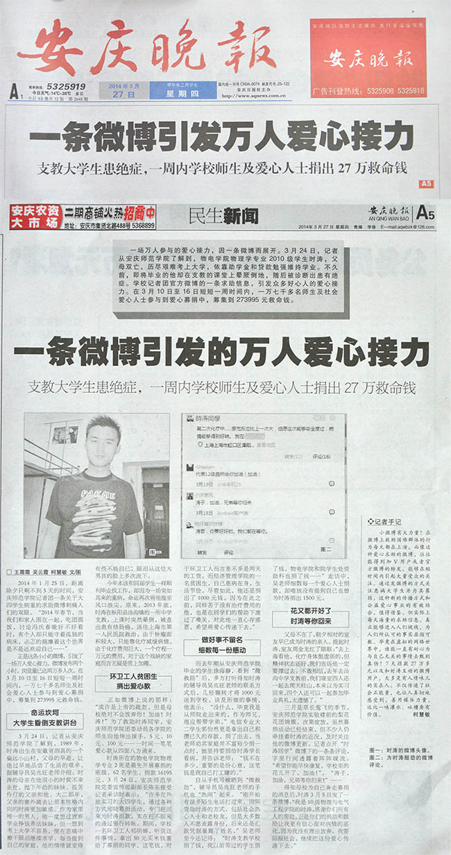 此条新闻一经刊出,引起巨大反响,国内多家门户网站在重要版块予以转载。省内纸媒《江淮晨报》也以“全校师生用爱心助支教男生抗癌,大四男生昏倒支教讲台安庆师院师生捐27万”为题,对永利官网师生汇爱成河的义举加以报道。《安庆晚报》更是用了整个版面,对这件发生在安庆高校的爱心接力的正能量新闻作了深度挖掘。(宣传部)